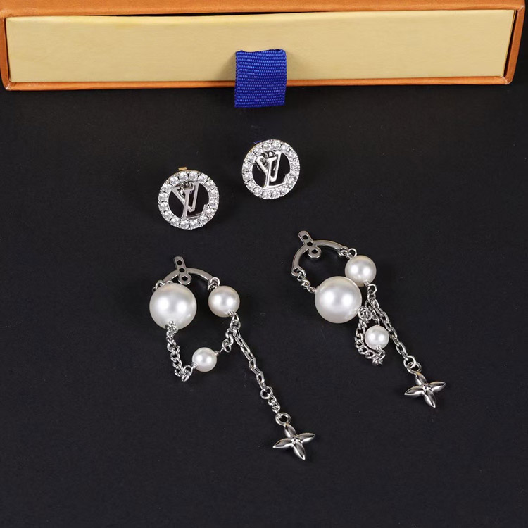 Louis Vuitton LV silver letter diamond pearl tassel earrings-3865